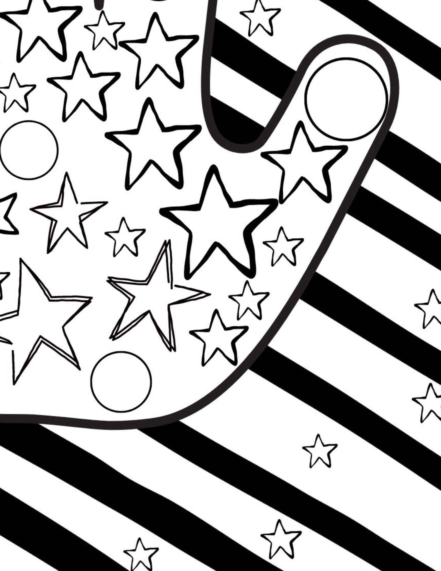 A fun coloring page that features a large outline of an open hand, stars, stripes and circles. The use of the black outline provides a good visual to guide those that color guidance to help remain inside the lines. This is great for Memorial Day, Flag Day, and July 4th. Enjoy coloring the hand filled with mixture of stars and circles, creating an engaging pattern within the hand's outline.